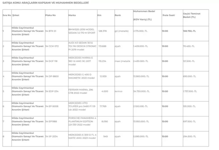 İhalenin yer ve saati belli olurken katılacakların ödeyecekleri teminatlar ve araçların fiyat listesi de yayımlandı.