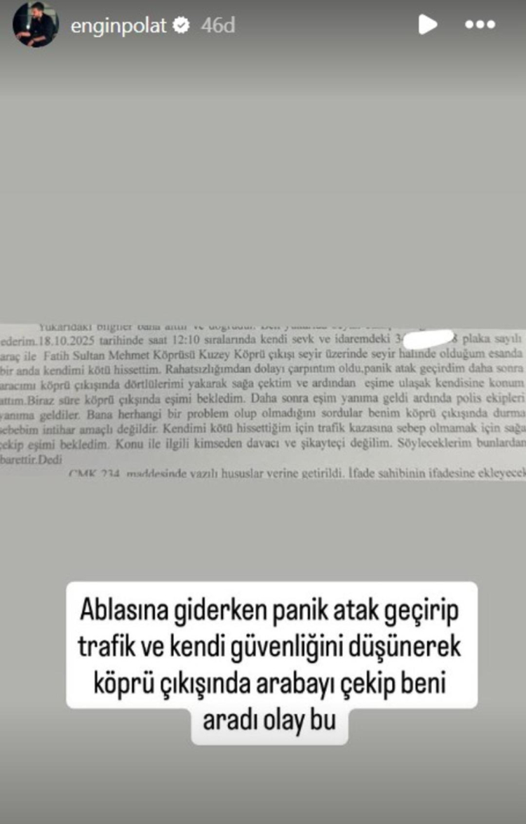 Engin Polat ise iddiaların ardından sessizliğini bozarak açıklama yaptı. Engin Polat, Dilan Polat'ın ablasına giderken trafikte panik atak geçirdiğini söyledi. Bu nedenle aracını yol kenarına çıktığını belirten Polat, olayın sadece bundan ibaret olduğunu dile getirdi: