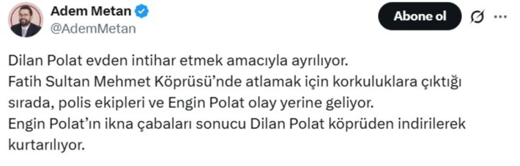 Engin Polat’ın ikna çabaları sonucu Dilan Polat köprüden indirilerek kurtarılıyor.”