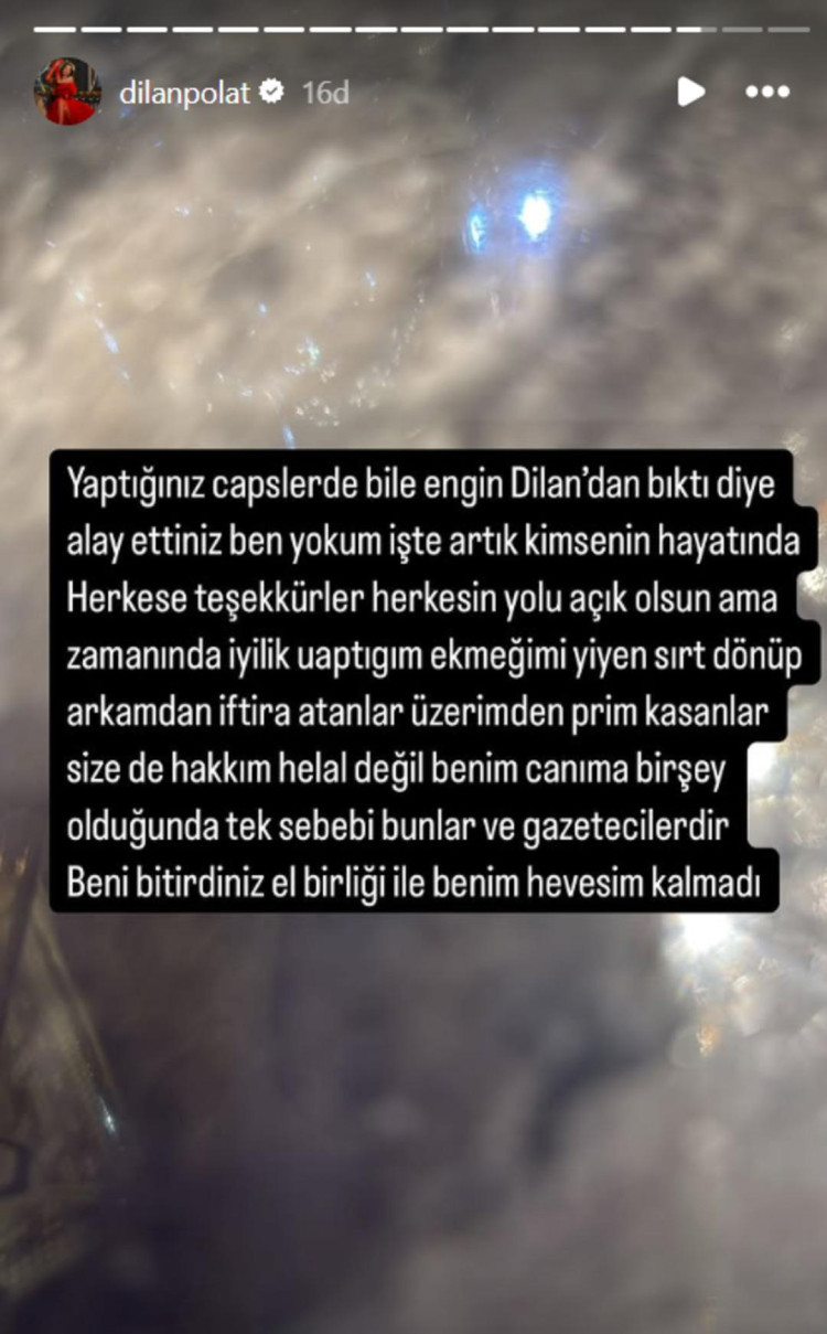 Dilan Polat sosyal medyasından yaptığı paylaşımda "Biz bir arada zarar ziyanız. olmuyor demek ki. Ben farkında olmadan iyi niyetim ile zarar veriyorum uzaklaşmak istiyorum herkesten her şeyden yaşama hevesim de kalmadı. Eşim Engin Polat ile de yollarımı ayırma kararı aldım" dedi.