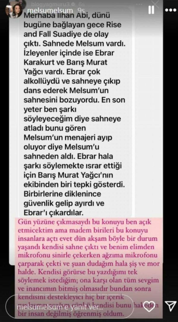 “Dünü bugüne bağlayan gece Rise and Call Suadiye’de olay çıktı. Sahnede Melsum vardı. İzleyenler içinde de Ebrar Karakurt ve Barış Murat Yağcı da vardı. Ebrar çok alkollüydü ve sahneye çıkıp dans ederek Melsum’un sahnesini bozdu. En son yeter ben şarkı söyleyeceğim diye sahneye atladı bunu gören Melsum’un menajeri ayıp oluyor diye Melsum’u sahneden aldı. Ebrar hâlâ şarkı söylemekte ısrar ettiği için Barış Murat Yağcı’nın ekibinden biri tepki gösterdi. Birbirlerine diklenince güvenlik gelip ayırdı ve Ebrar’ı çıkardılar.”