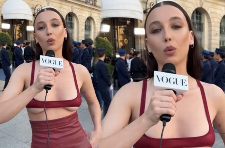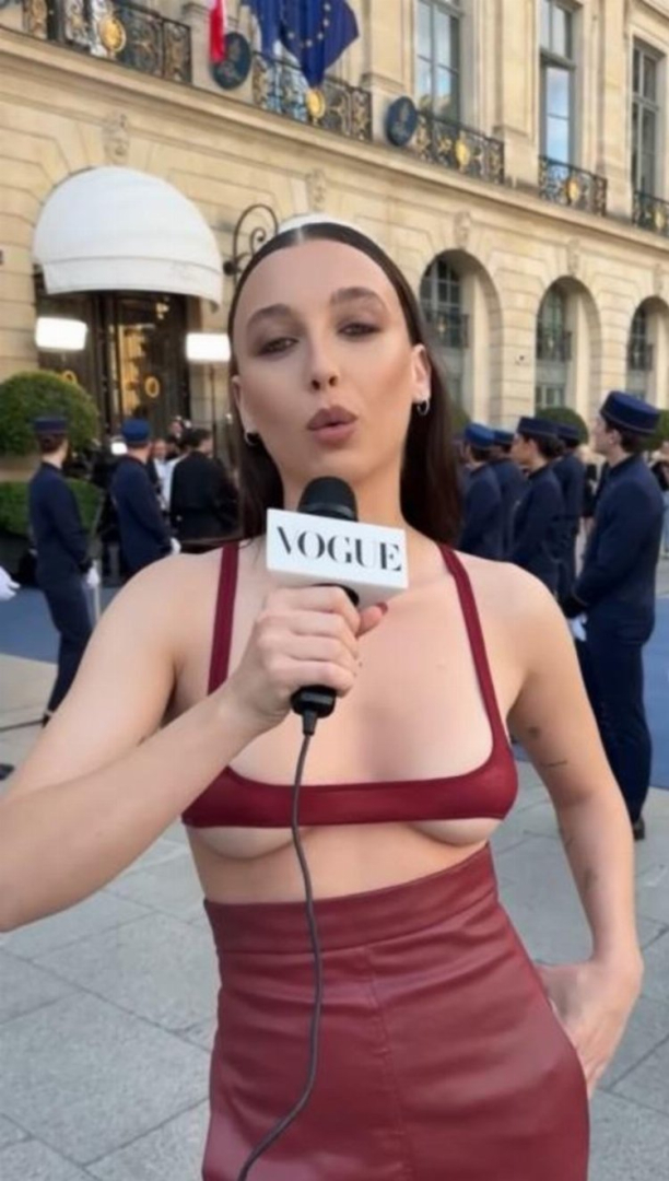Emma Chamberlain, Paris Moda Haftası kapsamında Vogue World'de kırmızı halıda göğüs altını gösteren ince askılı sütyen üstüyle dikkatleri üzerine çekti.