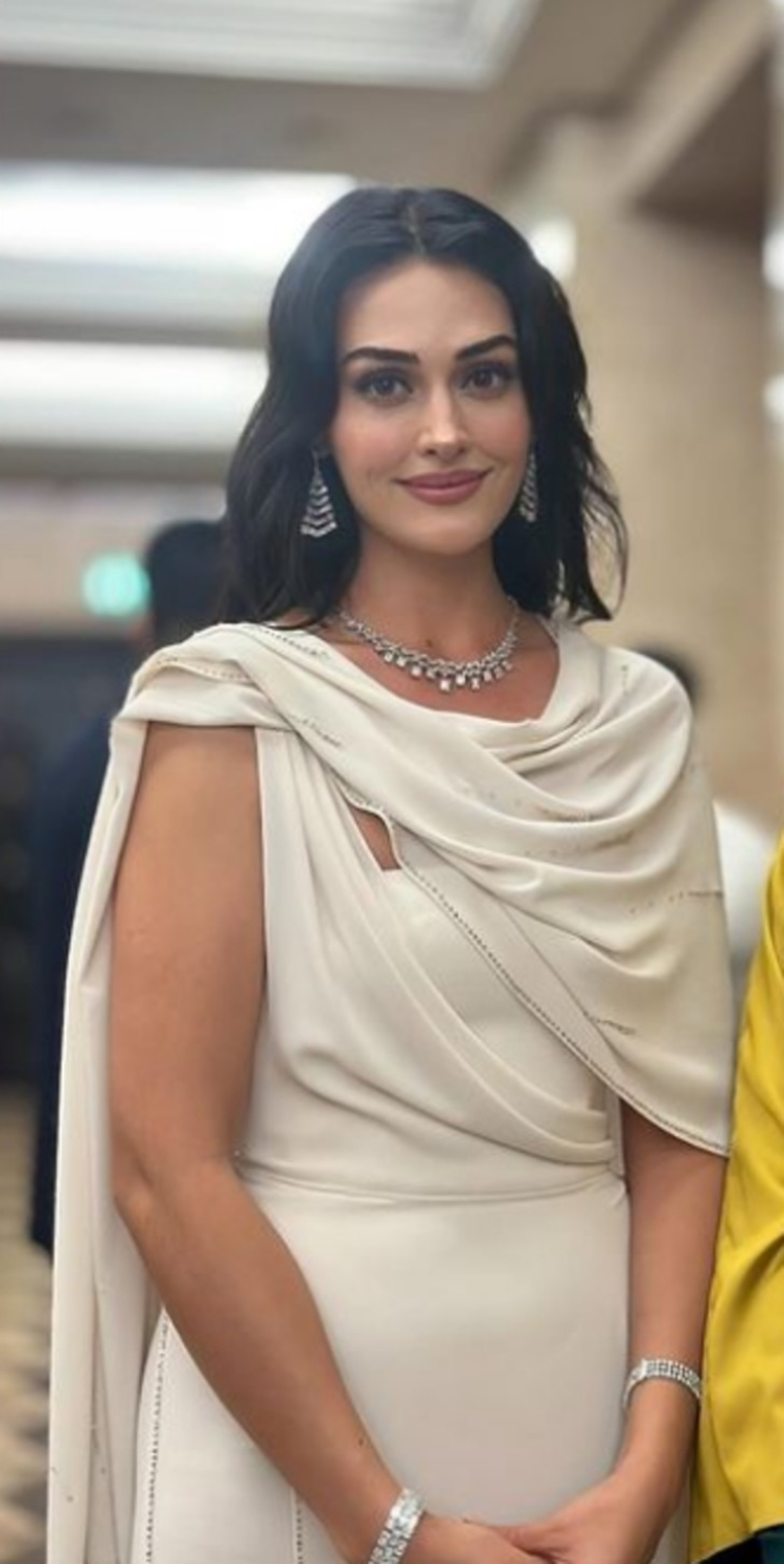 Geceye ise beyaz bir elbise ile katılan Esra Bilgiç omuzlarını ve göğüs dekoltesini bir şalla kapadı.