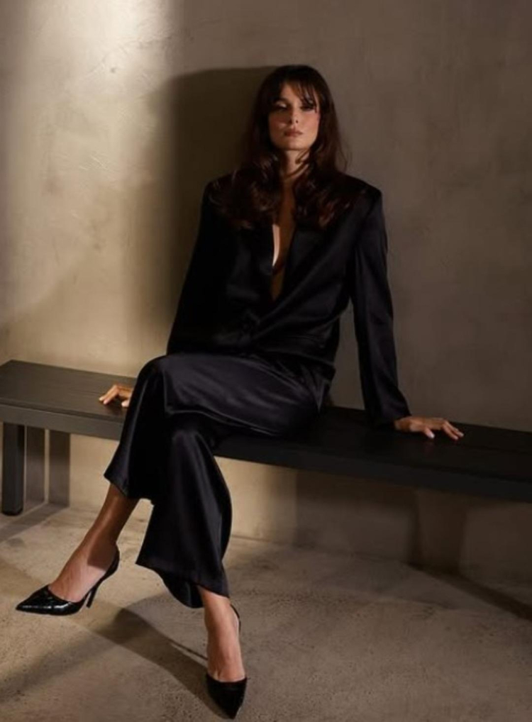Siyah bir takım elbise giyen Develi ceketinin içine ise hiçbir şey giymedi. Büşra Develi'nin peş peşe yayınladığı kareler kısa sürede beğeni ve yorum yağmuruna tutuldu.