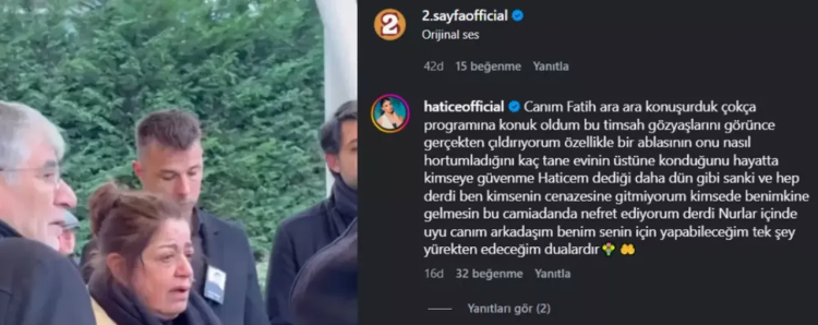 "Canım Fatih ara ara konuşurduk çokça programına konuk oldum bu timsah gözyaşlarını görünce gerçekten çıldırıyorum özellikle bir ablasının onu nasıl hortumladığını kaç tane evinin üstüne konduğunu hayatta kimseye güvenme Haticem dediği daha dün gibi sanki ve hep derdi ben kimsenin cenazesine gitmiyorum kimsede benimkine gelmesin bu camiadan da nefret ediyorum derdi Nurlar içinde uyu canım arkadaşım.