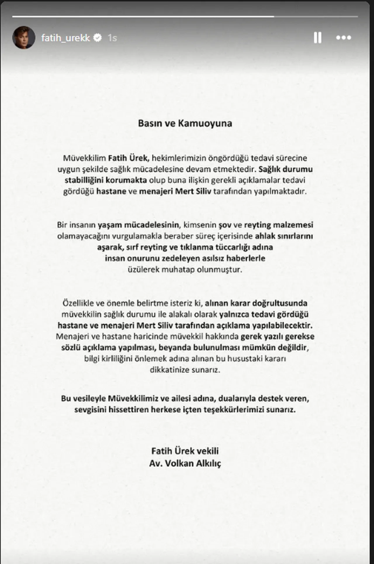 Fatih Ürek'in sosyal medya hesabından yapılan açıklamada; "Müvekkilim Fatih Ürek, hekimlerimizin öngördüğü tedavi sürecine uygun şekilde sağlık mücadelesine devam etmektedir. Sağlık durumu stabilliğini korumakta olup buna ilişkin gerekli açıklamalar tedavi gördüğü hastane ve menajeri Mert Siliv tarafından yapılmaktadır. Bir insanın yaşam mücadelesinin, kimsenin şov ve reyting malzemesi olamayacağını vurgulamakla beraber süreç içerisinde ahlak sınırlarını aşarak, sırf reyting ve tıklanma tüccarlığı adına insan onurunu zedeleyen asılsız haberlerle üzülerek muhatap olunmuştur. Özellikle ve önemle belirtmek isteriz ki, alınan karar doğrultusunda müvekkilin sağlık durumu ile alakalı olarak yalnızca tedavi gördüğü hastane ve menajeri Mert Siliv tarafından açıklama yapılabilecektir. Menajer ve hastane haricinde müvekkil hakkında gerek yazılı gerekse sözlü açıklama yapılması, beyanda bulunulması mümkün değildir; bilgi kirliliğini önlemek adına alınan bu husustaki kararı dikkatinize sunarız. Bu vesileyle Müvekkilimiz ve ailesi adına, dualarıyla destek veren, sevgisini hissettiren herkese içten teşekkürlerimizi sunarız" dedi.