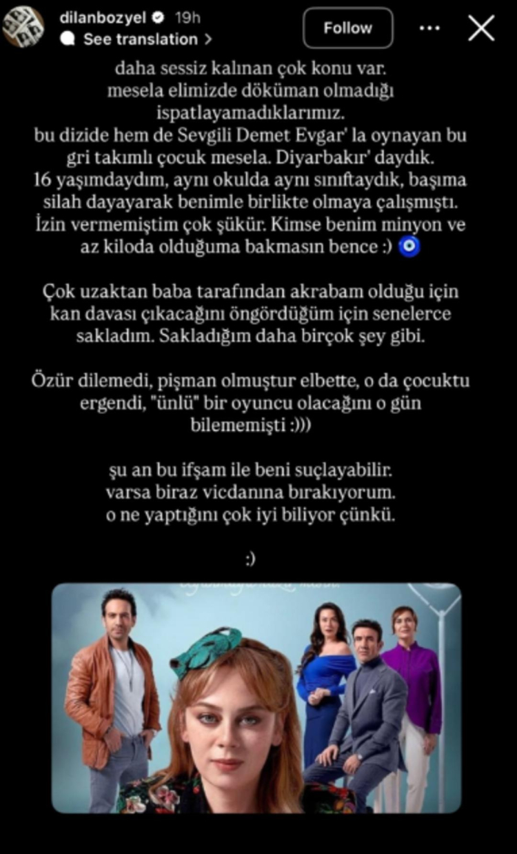 Çok uzaktan baba tarafından akrabam olduğu için kan davası çıkacağını öngördüğüm için senelerce sakladım. Sakladığım daha birçok şey gibi. Özür dilemedi, pişman olmuştur elbette, o da çocuktu ergendi, 'ünlü' bir oyuncu olacağını o gün bilememişti. Şu an bu ifşam ile beni suçlayabilir. Varsa biraz vicdanına bırakıyorum. o ne yaptığını çok iyi biliyor çünkü.'' ifadelerini kullandı.
