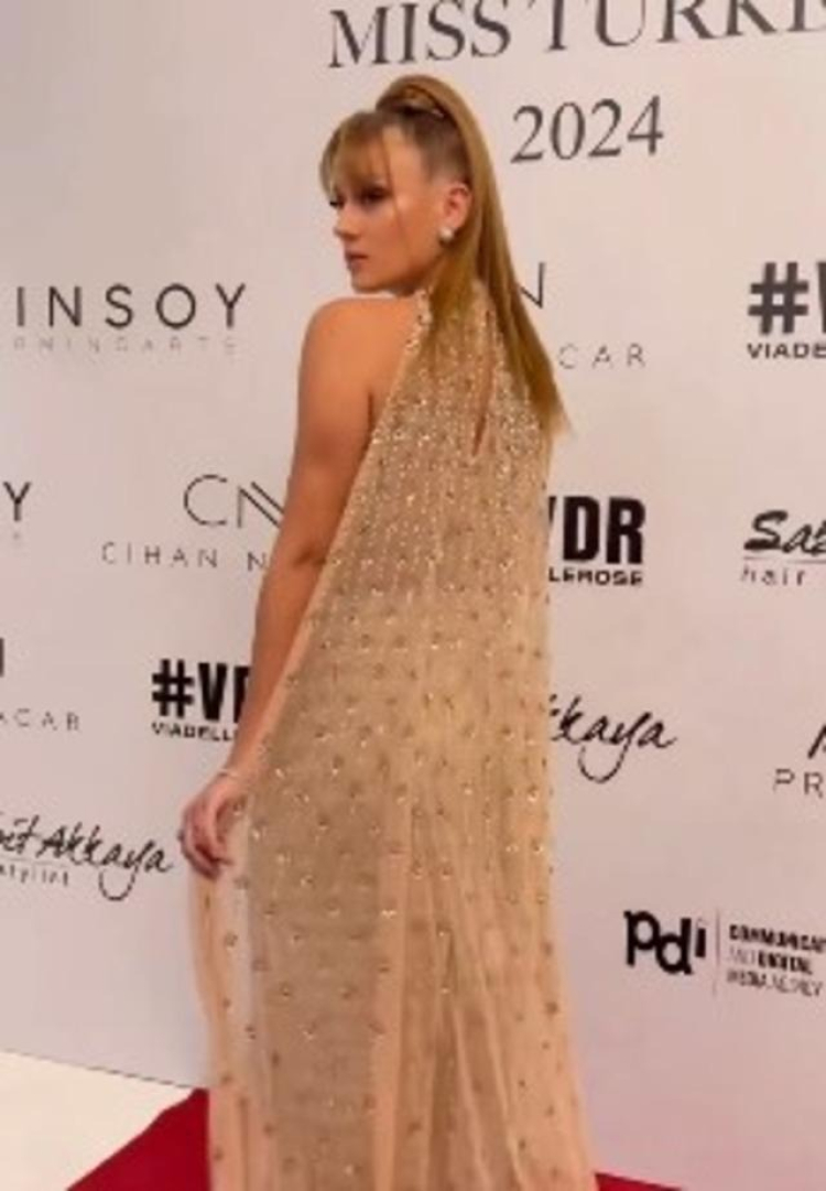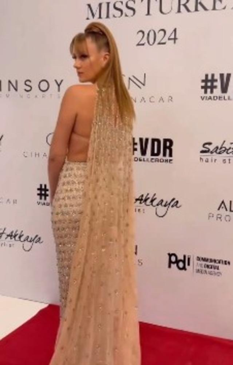 Geceye tamamen pullu derin sırt dekolteli ve tül detaylı elbisesi ile katılan Gizem Karaca kameralar önünde poz verirken 'sırtımı da göstereyim' deyip arkasını döndü.