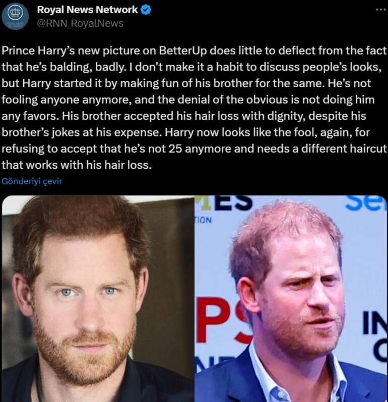 Harry, William’a o kadar bilenmişti ki kitabında onun kelleşen saçlarıyla ilgili yorum bile yapmış hatta ağabeyiyle dalga geçmişti. Prens William'ın kelleşen kafası hakkında yazan Harry durumu "endişe verici" olarak nitelendirmiş ve "benimki böyle değil, William’ın durumu daha kötü" yazarak onunla dalga geçmeye çalışmıştı. Küskün prens Harry’nin son fotoğrafı ise akıllara “gülme komşuna gelir başına” sözünü anımsattı ve sosyal medyada dalga konusu oldu…