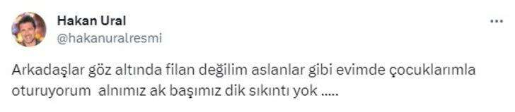 Sık sık açıklamalarıyla gündem olan Hakan Ural ile ilgili son olarak 'Gözaltına alındı' iddiası ortaya atılmıştı. Bu iddianın ardından Hakan Ural'dan bir açıklama geldi. Sosyal medya hesabından paylaşım yapan Ural, "Arkadaşlar gözaltında filan değilim. Aslanlar gibi evimde çocuklarımla oturuyorum" dedi.