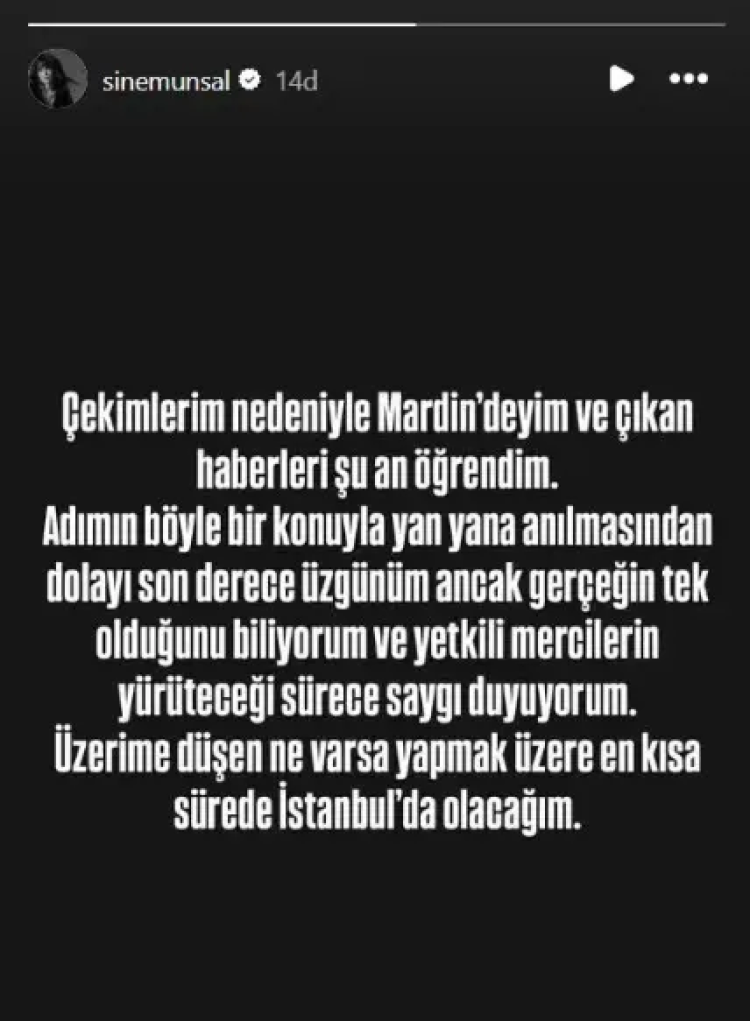 Çekimler nedeniyle Mardin'de olduğunu kaydeden Ünsal, "Çıkan haberleri şu an öğrendim. Adımın böyle bir konuyla yan yana anılmasından dolayı son derece üzgünüm ancak gerçeğin tek olduğunu biliyorum ve yetkili mercilerin yürüteceği sürece saygı duyuyorum" ifadelerini kullandı.
