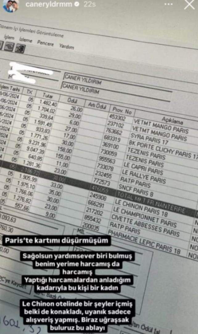 Ünlü oyuncu Hande Erçel'in ablası Gamze Erçel'in eşi Caner Yıldırım sosyal medya paylaşımlarıyla sık sık gündem oluyor. Yıldırım bu defa Paris'te kredi kartını düşürdüğünü anlattı.
