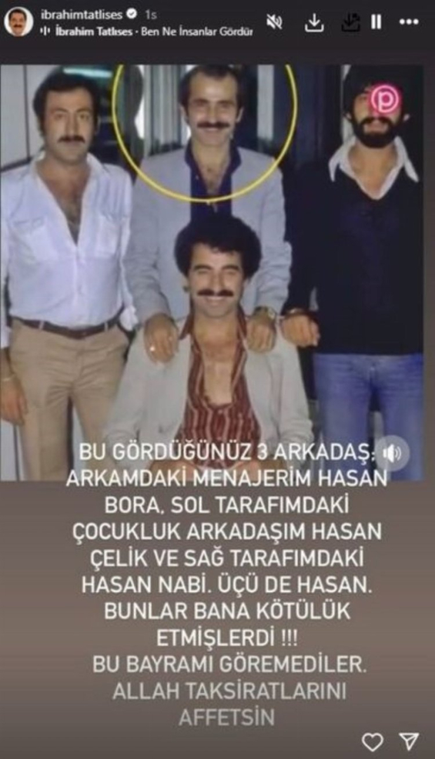 İbrahim Tatlıses, yayımladığı fotoğrafta; "Bu gördüğünüz üç arkadaş arkamdaki menajerim Hasan Bora, sol tarafımdaki çocukluk arkadaşım Hasan Çelik ve sağ tarafımdaki Hasan Nabi... Üçü de Hasan, bana kötülük etmişlerdi. Bu bayramı göremediler. Allah, taksiratlarını affetsin" ifadelerini kullanmıştı.