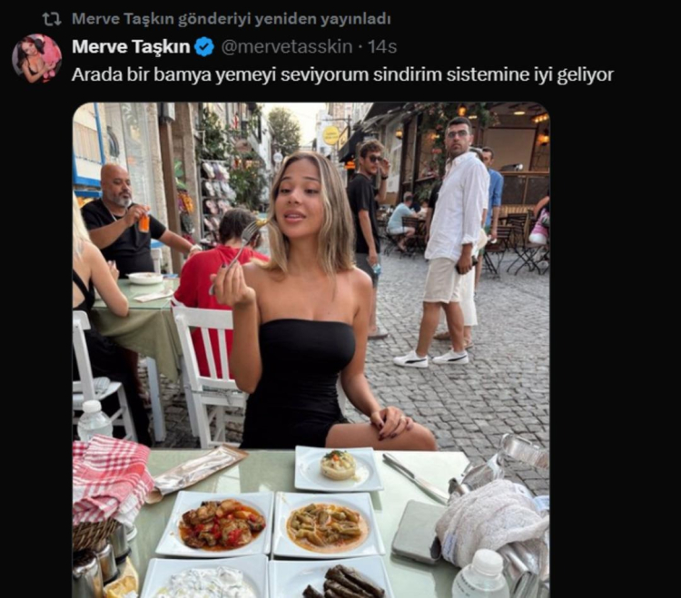 Yaşananlar sürerken müstehcen paylaşımlarıyla adından söz ettiren Merve Taşkın'dan "bamyalı" bir gönderme geldi! 'Arada bir bamya yemeyi seviyorum sindirim sistemine iyi geliyor' diyen Merve Taşkın'ın bamya yerken paylaştığı görüntü üzerine binlerce Icardi yorumu ve capsi yapıldı.