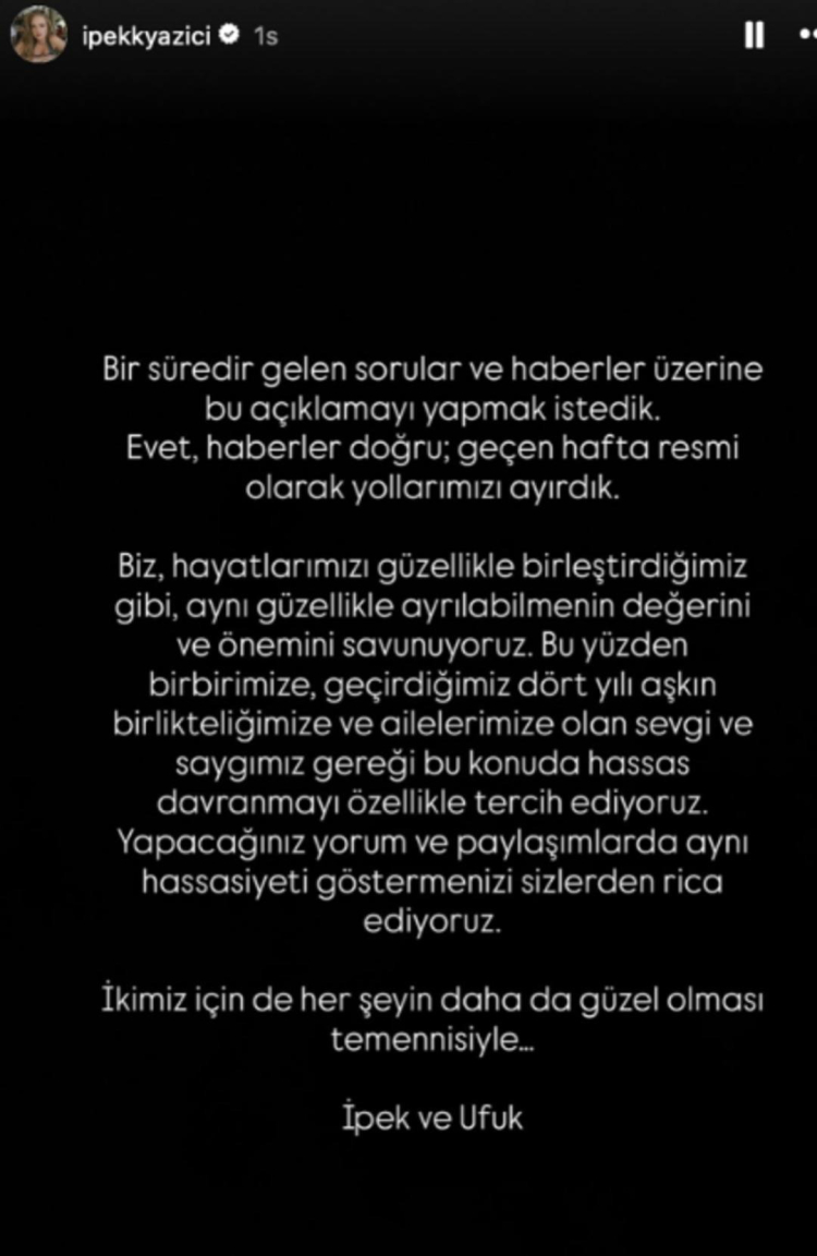 "Bir süredir gelen sorular ve haberler üzerine bu açıklamayı yapmak istedik. Evet haberler doğru; geçen hafta resmi olarak yollarımızı ayırdık. Biz, hayatlarımızı güzellikle birleştirdiğimiz gibi, aynı güzellikle ayrılabilmenin değerini ve önemini savunuyoruz. Bu yüzden birbirimize, geçtiğimiz dört yılı aşkın birlikteliğimize ve ailelerimize olan sevgi ve saygımız gereği bu konuda hassas davranmayı özellikle tercih ediyoruz. Yapacağınız yorum ve paylaşımlarda aynı hassasiyeti göstermenizi sizlerden rica ediyoruz. İkimiz için de her şeyin daha da güzel olması temennisiyle..."