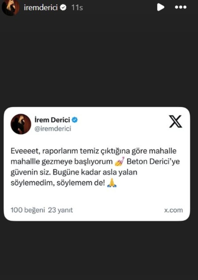 Test sonucu temiz çıkan İrem Derici sosyal medya üzerinden bir paylaşım yaparak; "Raporlarım temiz çıktığına göre mahalle mahallle gezmeye başlıyorum. Beton Derici'ye güvenin siz. Bugüne kadar asla yalan söylemedim, söylemem de." ifadelerini kullandı.