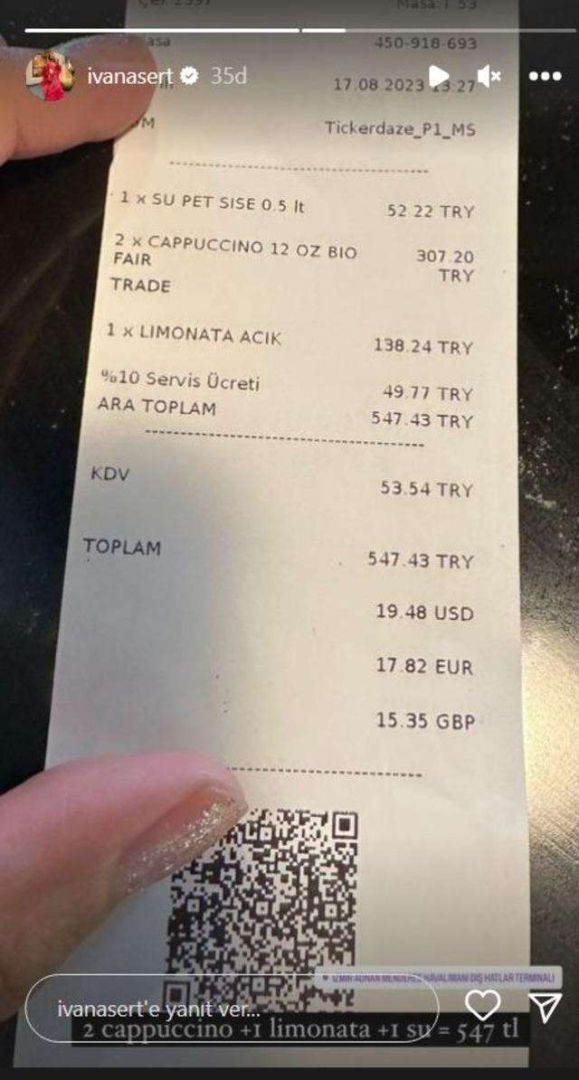 Sosyal medya paylaşımlarıyla ve tarzıyla çok konuşulan Ivana Sert havaalanından yaptığı paylaşımla dikkat çekti. Kahve, su ve limonataya ödediği parayı paylaşan Sert sosyal medyada gündem oldu.