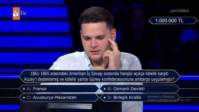 Kim Milyoner Olmak İster'de tarihi bir anlara bir yenisi eklendi. Rabia Birsen Güvercin'in 1 Milyon TL büyük ödülü kazanmasının ardından bir diğer yarışmacı Ahmet Talha Dağlı da yine 1 milyon TL'lik soruyu açtırdı. Yayınlanan bölümde nefesler tutuldu, doğru cevap beklendi.