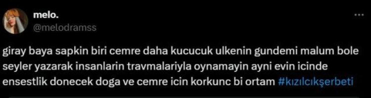 3. sezonun ilk bölümüyle yayına başlayan Kızılcık Şerbeti'nin yeni bölümünde Giray ve üvey annesinin ateşli sahnesi gündem oldu. İki karakterin yaşadığı yasak ilişki tepki çekti.