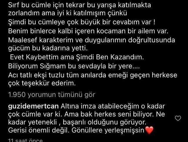 Şimdi bu cümleye çok büyük bir cevabım var! Benim binlerce kalbi içeren kocaman bir ailem var. Maalesef karakterim ve duygularımın doğrultusunda gücüm bu kadarına yetti. Evet Kaybettim ama Şimdi Ben Kazandım. Biliyorum Sığmam bu sevdayla bir yere. Acı tatlı ekşi tuzlu tüm anılarda emeği geçen herkese çok teşekkür ederim."