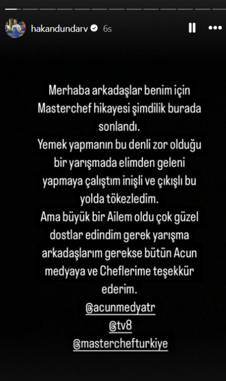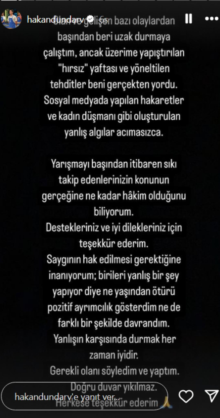 MasterChef Hakan "Bazı olaylardan başından beri uzak durmaya çalıştım ancak üzerime yapıştırılan hırsız yaftası ve yöneltilen tehditler beni gerçekten yordu. Sosyal medyada yapılan hakaretler ve kadın düşmanı gibi oluşturulan yanlış algılar acımasızca" dedi.