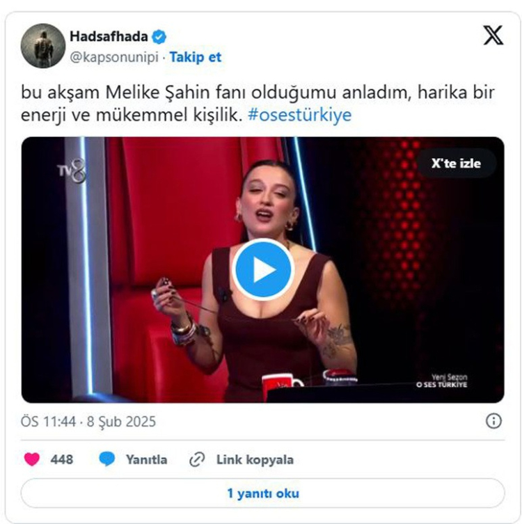 TV8'in şarkı yarışması olan O Ses Türkiye, uzun bir aradan sonra dün akşam yeniden seyirciyle buluştu. Hadise, Beyazıt Öztürk ve Gökhan Özoğuz'un jüri koltuklarının yanına Melike Şahin dahil oldu. Melike Şahin yarışmadaki halleriyle sosyal medyadan tam puan aldı.