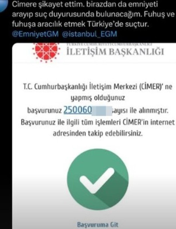 Sosyal medyada tepki gösterilen Merve Taşkın'a; 'Cimer'e şikayet ettim', 'Emniyeti arayıp suç duyurusunda bulunacağım' gibi mesajlar atıldı.