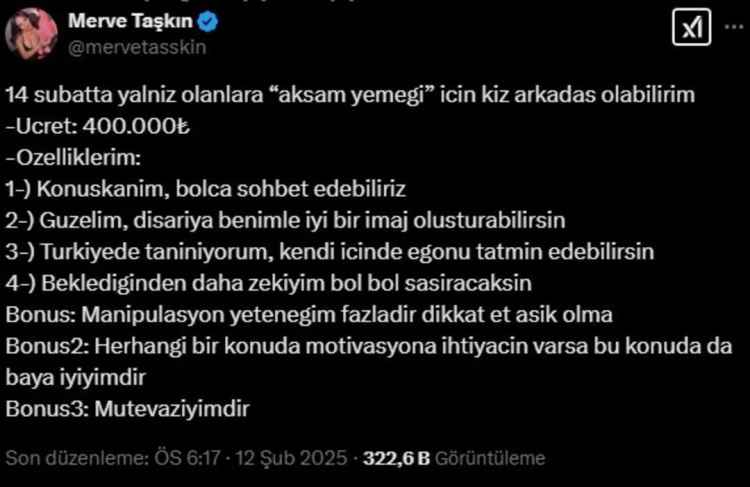 Sosyal medya hesabından bir ilan yayınlayan Merve Taşkın, 14 Şubat'ta yalnız olanlar için ücret karşılığında akşam yemeği teklif etti ve 400 bin TL'de ücret belirledi.