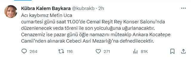 Uca'nın cenazesinin ise, Pazar günü öğle namazını müteakip Ankara Kocatepe Camii’nden alınarak Cebeci Asri Mezarlığı’na defnedileceği öğrenildi.