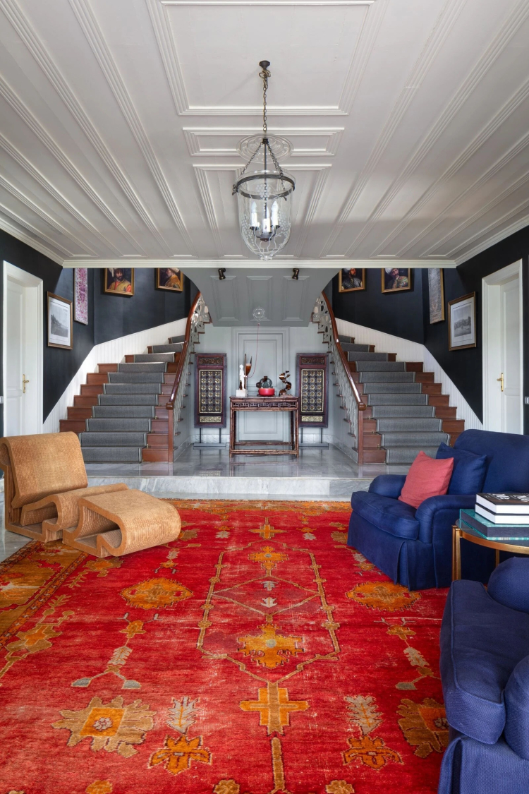 Evinde Uşak halısına da yer veren Caroline Koç, Frank Gehry'nin Contour sandalyesini de konumlandırmış. Boğaz'a akıyormuş gibi görünen sakin havuza, Çin heykelleri tiyatro havası katıyor. Osmanlı motifleri de gözlerden kaçmıyor.