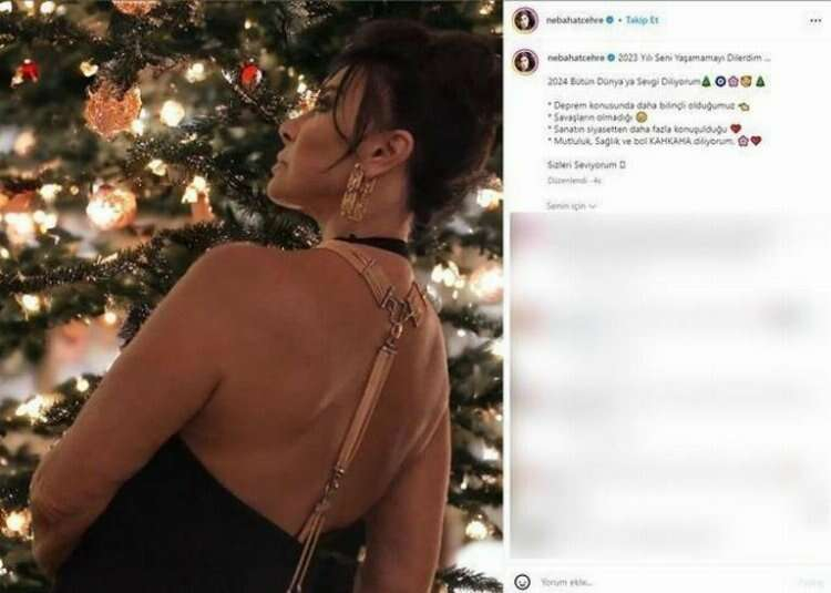 Çehre, bir çam ağacının yanında çektirdiği pozunu paylaştı. O pozun altına ise "2023 yılı seni yaşamamayı dilerdim. 2024 bütün dünyaya sevgi diliyorum. Deprem konusunda daha bilinçli olduğumuz, savaşların olmadığı, sanatın siyasetten daha fazla konuşulduğu, mutluluk, sağlık ve bol kahkaha diliyorum. Sizleri seviyorum" notunu düştü.