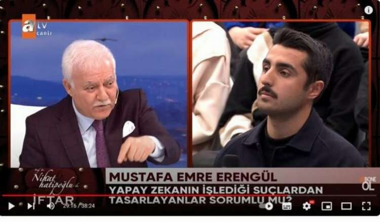 Sorudan yola çıkan Hatipoğlu, başına gelen bir olayı da açıkladı. Nihat Hatipoğlu, "Bu önemli bir konu aslında gelecekte başımızı ağırtacak. İleride bazı tedbirler alınmalı. Yapay zekayla ne yapıyorlar, geçen bana bir video gönderdiler. Beni konuşturuyorlar. Baktım videodaki benim ağzım dilim oynuyor, ama ben ne yapıyorum burada Din programı yapıyorum. Bana gönderilen videoda basur için merhem satıyorum. Üstelik merhemi de gösteriyorum bunu da ayarlamışlar, benim sesim ama ben hayatımda merhem satmadım" dedi.