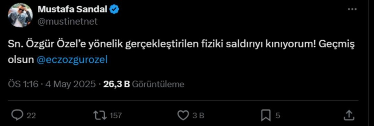 Özgür Özel'a yapılan saldırı sonrası Mustafa Sandal da sessiz kalmadı. Mustafa Sandal paylaşımında şunları yazdı: