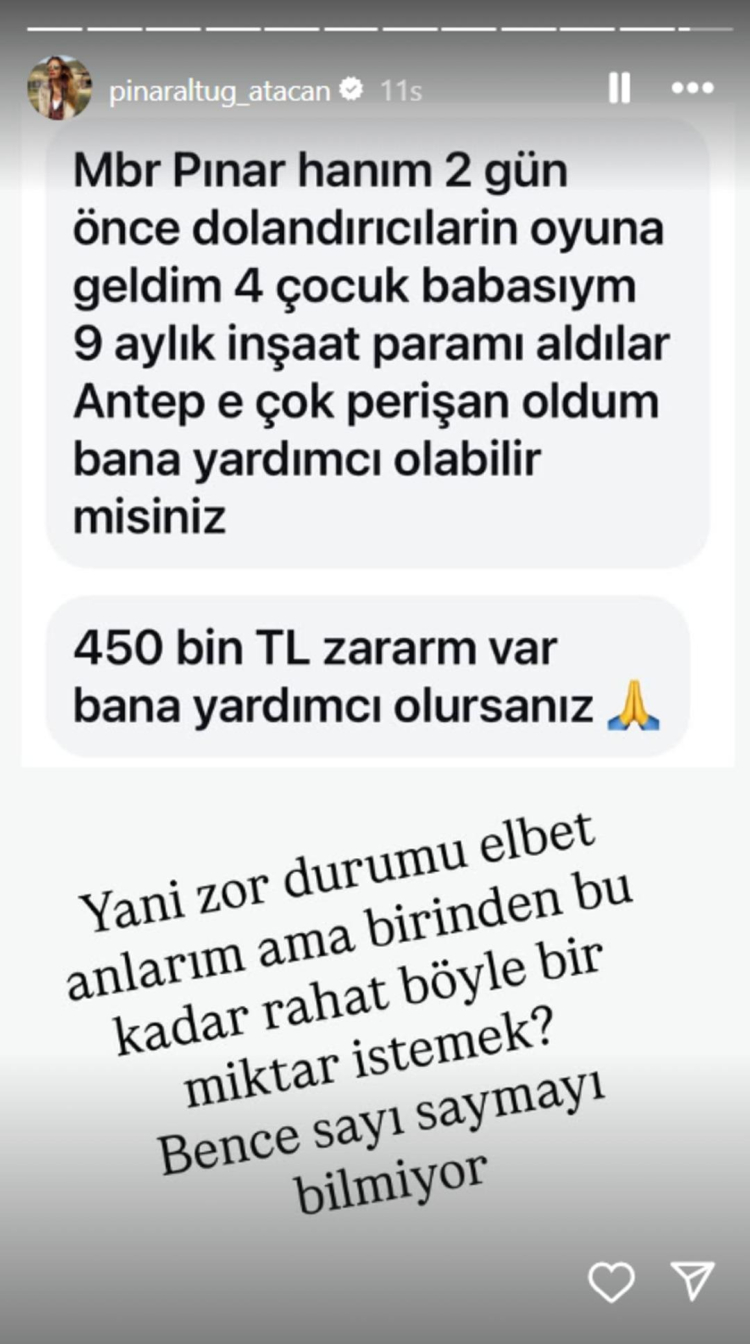 Altuğ'un takipçisi; Gaziantep’te yaşadığını, 9 aylık inşaat parasının alındığını iddia etti ve maddi olarak çok zor durumda olduğunu belirterek Pınar Altuğ’dan para istedi. Mesajdaki rahat üslup karşısında Altuğ şaşkınlığını gizleyemedi.
