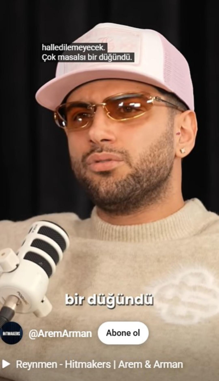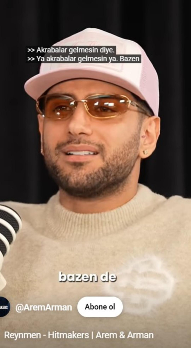 'Düğüne akrabalarını davet ettin mi?' sorusunu yanıtlayan Reynmen 'Düğün dediğin şey ben ve eşimle alakalı bir şey, akrabalar gelmesin. Akrabalarımı davet etmek aklıma bile gelmedi. Biz düğünde onların istediği gibi bir düğün yapmamışızdır laf olur, ben karımla öpüşecek olurum laf olur, ben sizi eğlendirmeye yapmadım ki düğünü, ben varım eşim var. Ben sizi çağıracağım diye yaşatacağınız stresle ben niye en güzel günümden veriyorum.' ifadelerini kullandı.