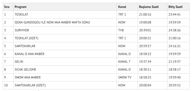 Dün akşam yayınlanan programlar arasında reyting sıralaması dikkat çekti. İzleyicilerin ilgisini çeken yapımların çeşitliliği gözler önüne serildi. Televizyon kanalları, izleyici taleplerine uygun içerik sunma noktasında ciddi bir rekabete devam ediyor.
