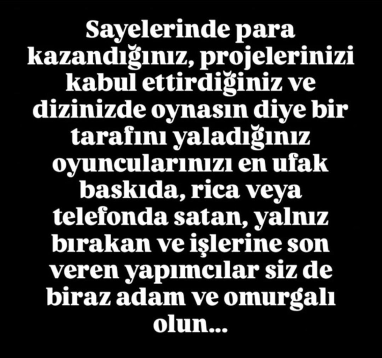 Gökbakar sosyal medya üzerinden yaptığı paylaşımda yapımcılara seslendi ve; "Sayelerinde para kazandığınız, projelerinizi kabul ettirdiğiniz ve dizinizde oynasın diye bir tarafını yaladığınız oyuncularınızı en ufak baskıda, rica veya telefonda satan, yalnız bırakan ve işlerine son veren yapımcılar siz de biraz adam ve omurgalı olun..." ifadelerini kullandı.