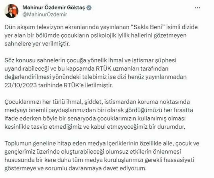 Bakan Göktaş, sosyal medya hesabından, "Sakla Beni" adlı dizide, çocuklarla ilgili kamuoyunda da eleştirilere sebep olan sahnelere ilişkin açıklama yaptı. Dizide yer alan bir bölümde çocukların psikolojik iyilik hallerini gözetmeyen sahnelere yer verildiğini belirten Göktaş, şu ifadeleri kullandı: