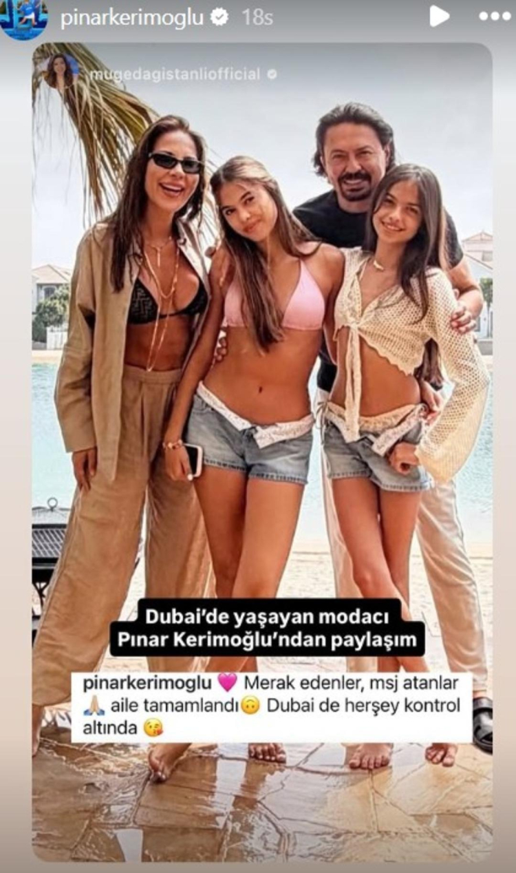 Kerimoğlu, yaptığı son paylaşımla eşine kavuştuklarını belirterek aile pozlarını sevenlerinin beğenisine sundu. Ünlü isim, eşi Yücel Bey'in de yer aldığı mutlu aile tablosunu ''Merak edenler, mesaj atanlar, aile tamamlandı. Dubai'de her şey kontrol altında'' notuyla yayımladı.