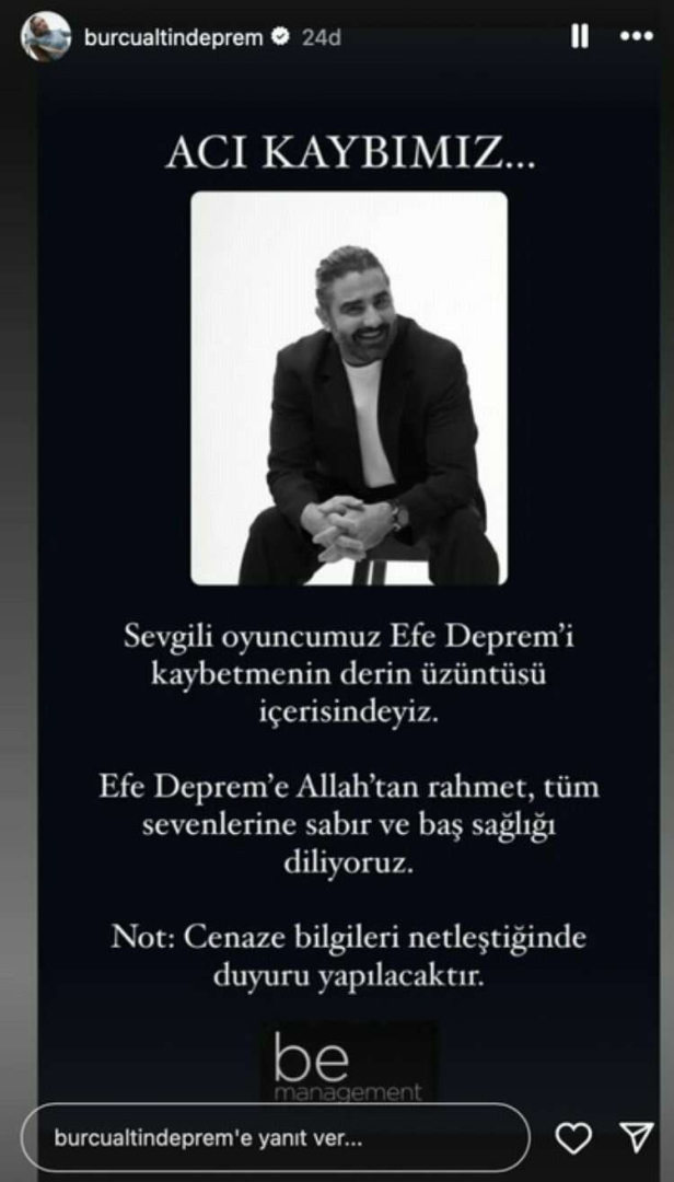 Deprem'in kendisi gibi oyuncu eşi Burcu Altın Deprem sosyal medya hesabından eşinin vefatını ise şu paylaşımla duyurdu: