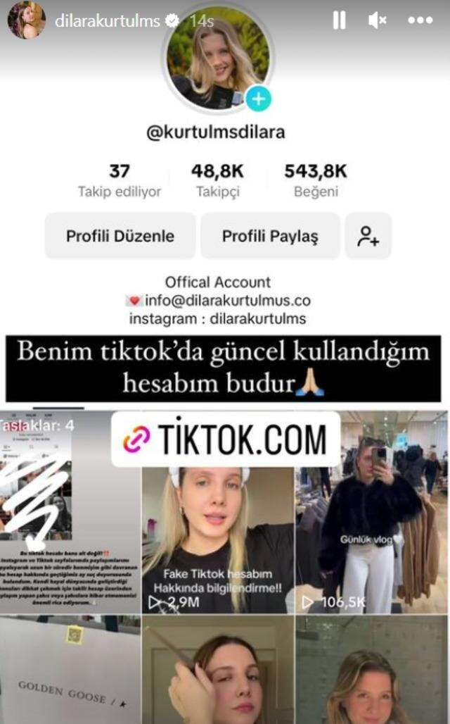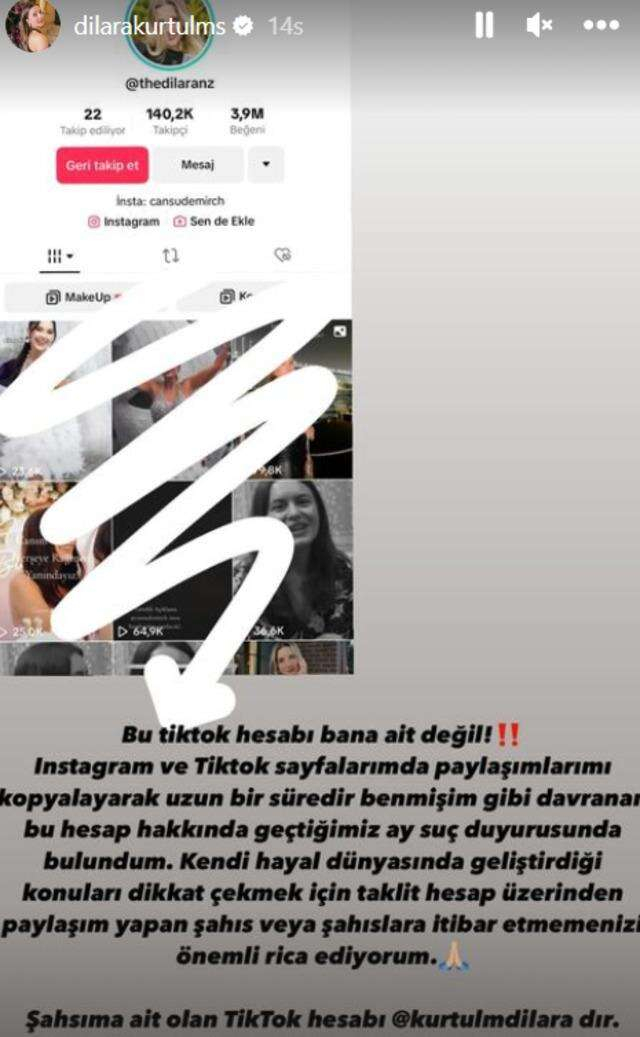 Dilara Kurtulmuş açıklamasında "Bu TikTok hesabı bana ait değil! Instagram ve TikTok sayfalarımda paylaşımlarımı kopyalayarak uzun bir süredir benmişim gibi davranan bu hesap hakkında geçtiğimiz ay suç duyurusunda bulundum." dedi.