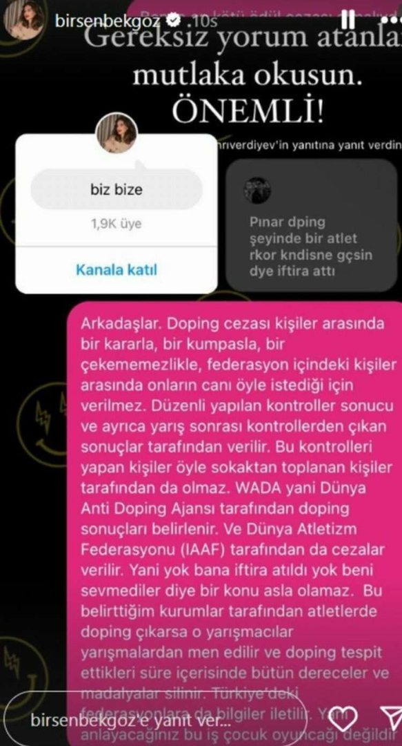 Bekgöz sözlerine; 'Kendi doğrularını kaybetmiş olanlar 'Pınar Saka' kendilerini çamura batmış olarak bulurlar. 400m Türkiye Rekoru Benim diye dolaşıyorsun. İnsanlara göz göre göre yalan söylüyorsun! 400m rekorun dopingli çıktığın için iptal edildi ve eski rekortmen olarak bana iade edildi' dedi.