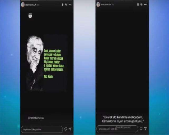 Serpil Tosun, sosyal medya hesabında "En çok da kendime mahcubum, olmazlarla ziyan ettim gönlümü" ifadesine yer verip Aziz Nesin'in şu sözlerini paylaşmıştı: