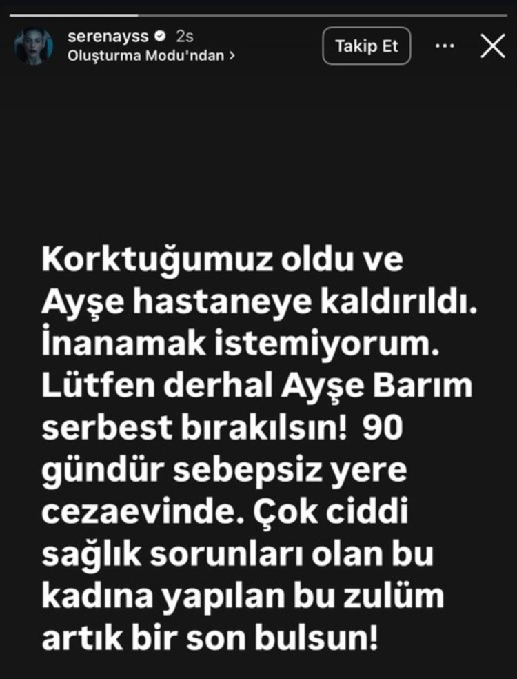 Serenay Sarıkaya, hastaneye kaldırılan menajeri Ayşe Barım hakkında paylaşım yaptı. Sosyal medyada Serenay Sarıkaya'nın günlerce sessiz kalmasından sonra sadece kendi arkadaşı için özgürlük istemesi ise büyük tepki çekti.