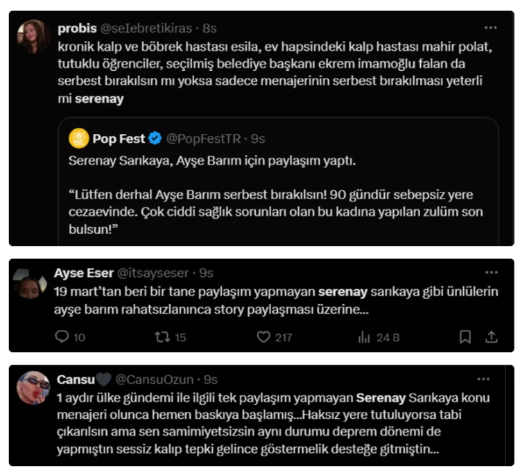 Ancak Serenay Sarıkaya'nın gündeme dair günlerce sessiz kalmasından sonra bu ifadeleri tepki çekti. Sarıkaya'ya tutuklu öğrenciler ve kısa süre önce hastalığı sebebiyle ev hapsi alan Mahir Polat hatırlatılarak "Sadece biricik dostunuza mı çıkıyor sesiniz?" tepkileri yağdı.