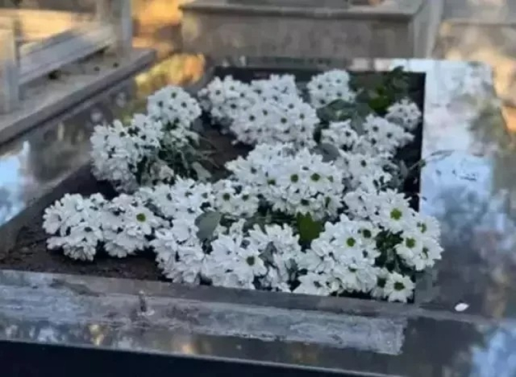 Öte yandan siyah granit taştan hazırlanan mezarın üzerinin papatyalarla kaplı olması dikkat çekti.
