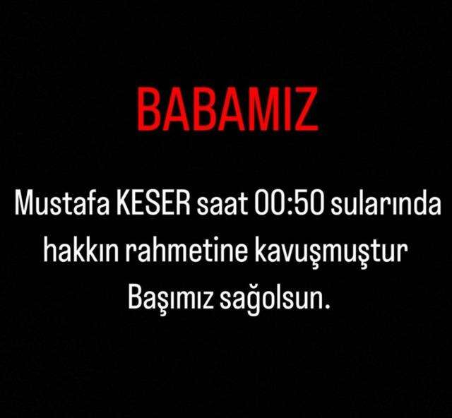 Ünlü isim Instagram hesabından yaptığı paylaşımda "Babamız Mustafa Keser saat 00:50 sularında Hakkın rahmetine kavuşmuştur. Başımız sağ olsun" dedi.