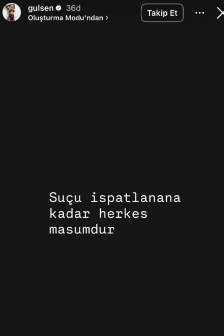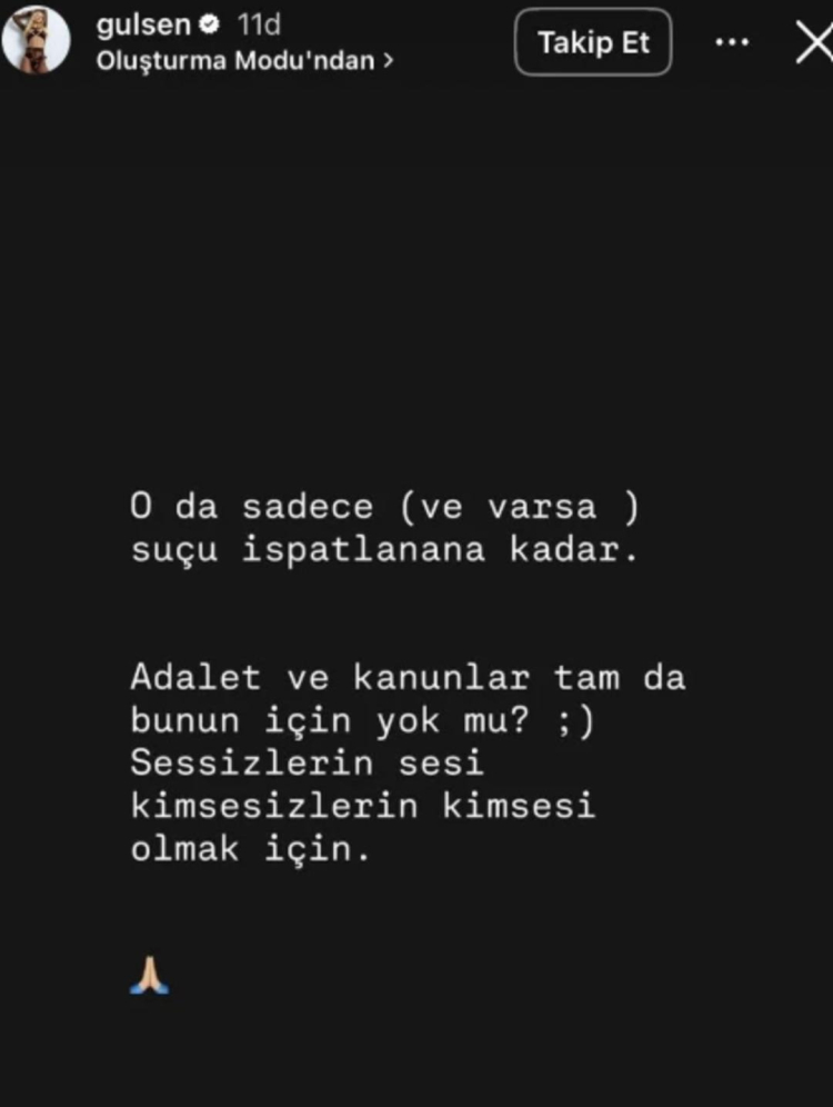Gülşen ikinci paylaşımında da şu ifadelere yer verdi: "O da sadece (ve varsa) suçu ispatlanana kadar. Adalet ve kanunlar tam da bunun için yok mu? Sessizlerin sesi, kimsesizlerin kimsesi olmak için."