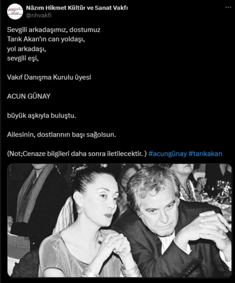 Yapılan açıklamada; "Sevgili arkadaşımız, dostumuz Tarık Akan’ın can yoldaşı, yol arkadaşı, sevgili eşi, Vakıf Danışma Kurulu üyesi Acun Günay, büyük aşkıyla buluştu. Ailesinin, dostlarının başı sağ olsun" denildi.