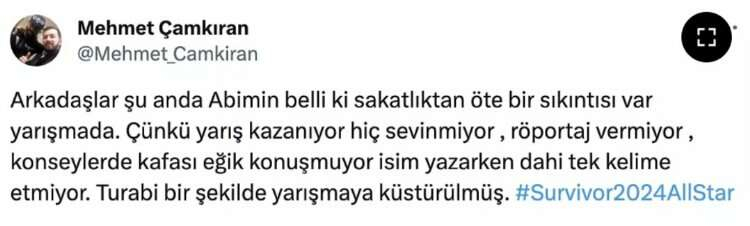 Survivor All Star'ın en iddialı ve en çok ses getiren yarışmacısı Turabi, son iki yarışmaya ve konseye katılmadı. Konuyla ilgili paylaşım yapan Turabi'nin kardeşi isyan etti. Çamkıran, "Abimin belli ki sakatlıktan öte bir sıkıntısı var yarışmada" dedi.